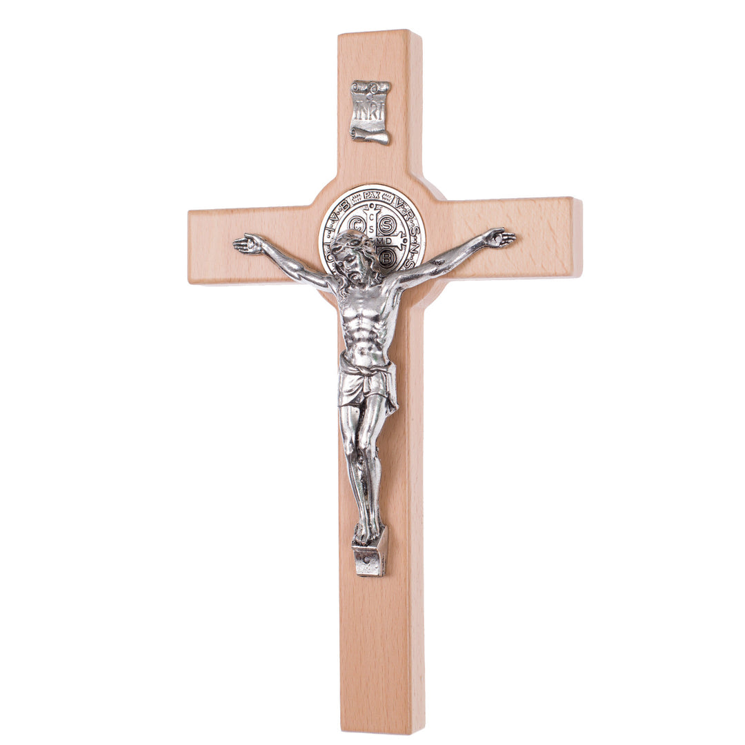 Houten hangend Sint Benedictus kruis met pasque naturel 28x16x1.8cm