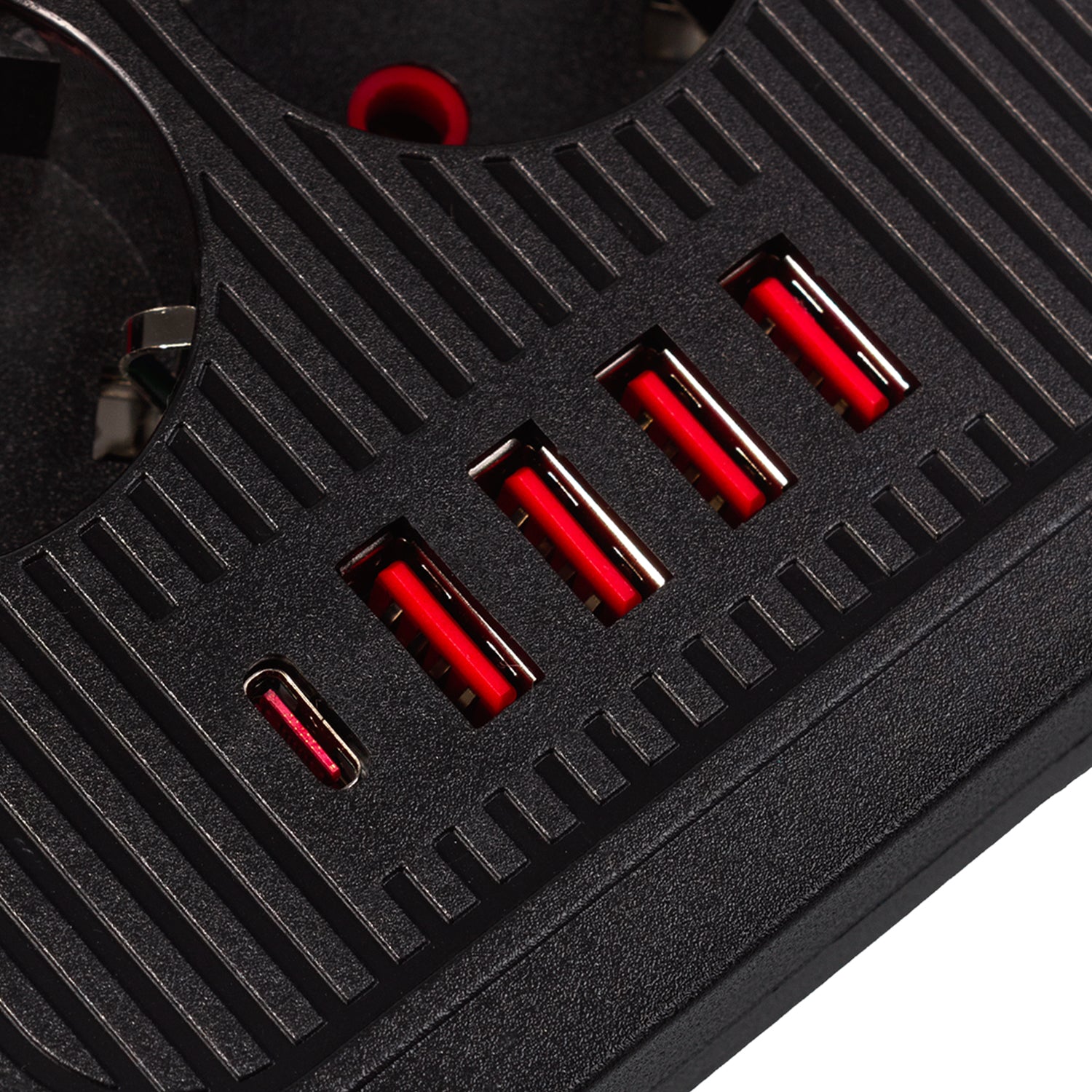 Moderne stekkerdoos met 6 stopcontacten, 4 USB-poorten en 1 USB-C poort is een geavanceerde oplossing voor gebruikers die meerdere apparaten tegelijk van stroom moeten voorzien. Hij is ideaal voor kantoren, studio's, gameruimtes en overal waar een groot aantal beschikbare stopcontacten en snel opladen van mobiele apparaten belangrijk is. Het hoge vermogen van 2500W en het solide vakmanschap garanderen veiligheid en betrouwbaarheid, elke dag weer.