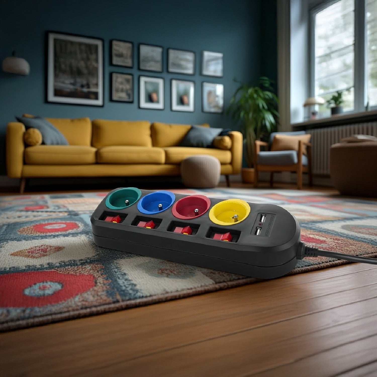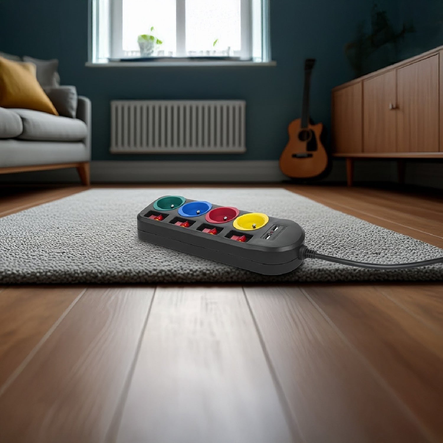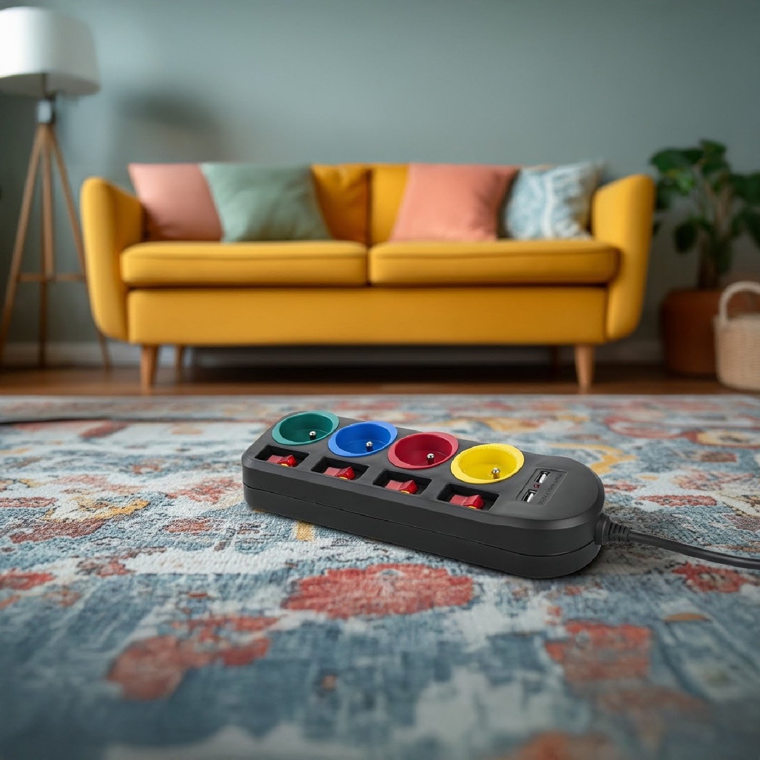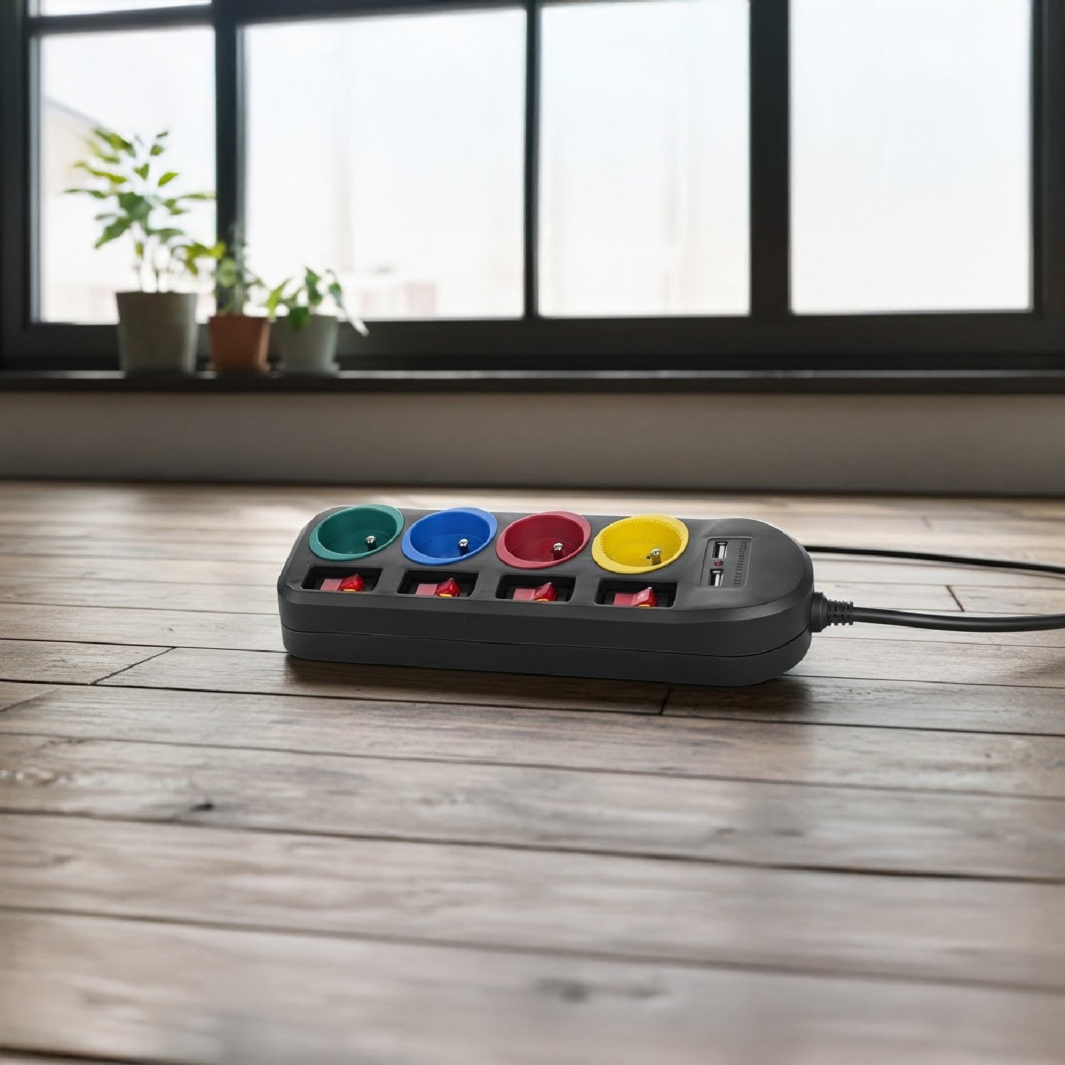 Het 4-stopcontact verlengsnoer maakt het mogelijk om tot vier full-size stopcontacten tegelijk aan te sluiten. Het is uitgerust met een kinderbeveiliging, aparte schakelaars voor elk stopcontact en 2 USB-poorten voor het opladen van apparaten zoals smartphones, tablets, digitale camera's enz.