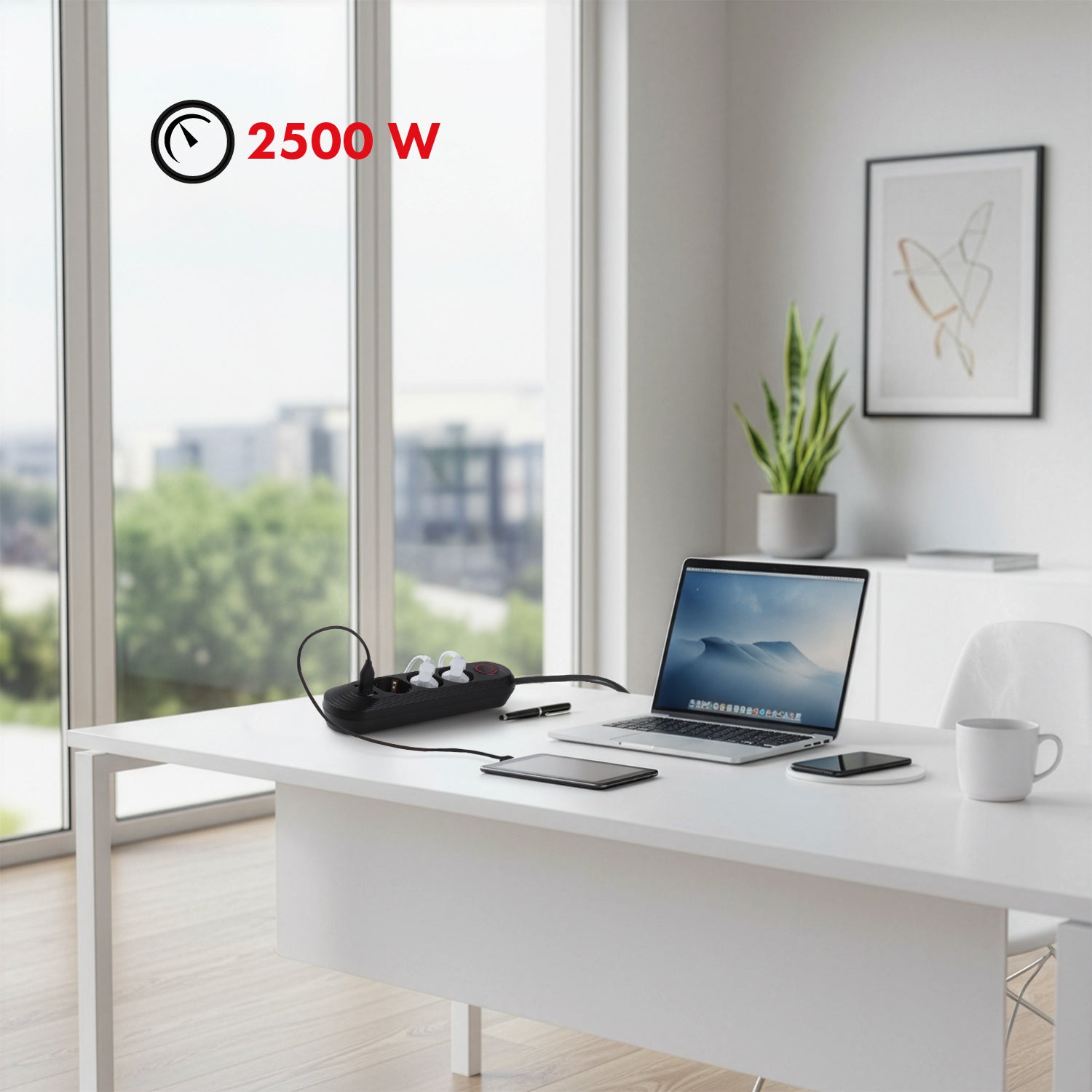 Met de stekkerdoos kun je apparatuur aansluiten met een totaal vermogen van maximaal 2500W, wat betekent dat je er gemakkelijk een computer, monitor, printer, tv, opladers of bureaulampen mee van stroom kunt voorzien. Componenten van hoge kwaliteit en een doordachte indeling van de stopcontacten beschermen de apparatuur tegen overbelasting en zorgen voor een stabiele werking, zelfs bij langdurige belasting.