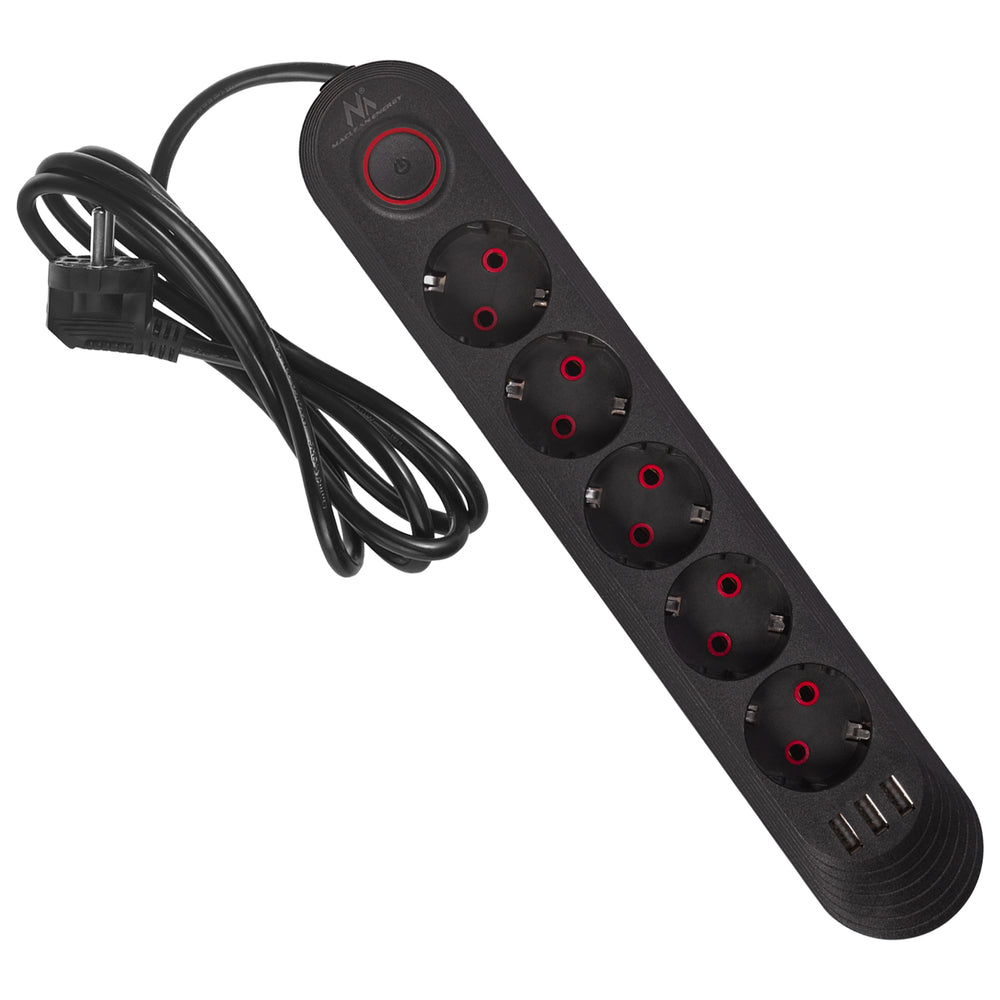 Maclean stekkerdoos, 5-polige verlengkabel + 3xUSB, 110-240V AC 50/60Hz, 2,1A max 2500W, 1,5m, zwart, MCE395 B