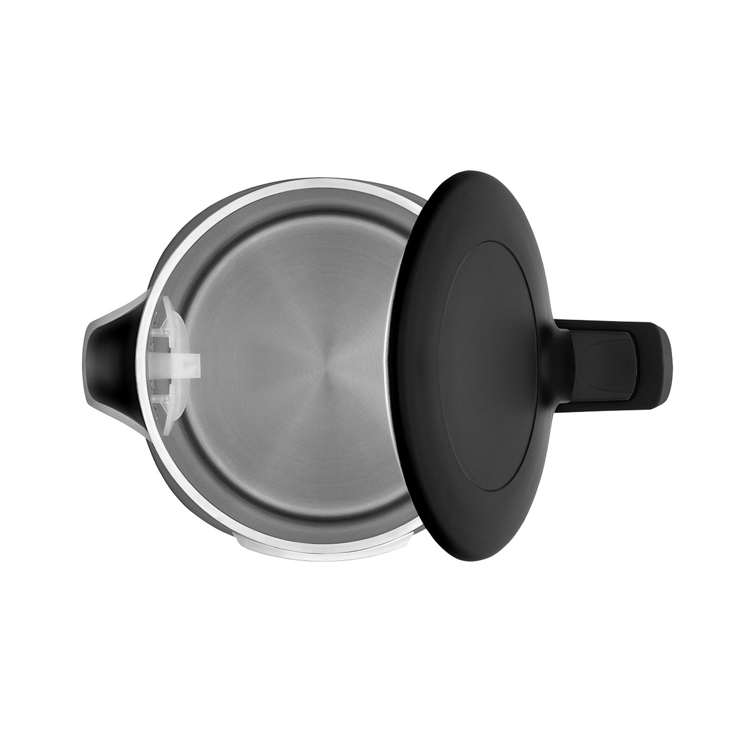 De waterkoker is uitgerust met een praktische knop voor het eenvoudig openen van het deksel met één druk op de knop, waardoor het vullen met water veel gemakkelijker wordt. De gladde bodem met verborgen verwarmingselement minimaliseert kalk- en vuilafzetting. Dankzij de volledig draaibare voet kan de waterkoker gemakkelijk aan elke kant worden neergezet en is er ook een plek om overtollig snoer op te bergen, zodat je keukenblad schoon en opgeruimd blijft.