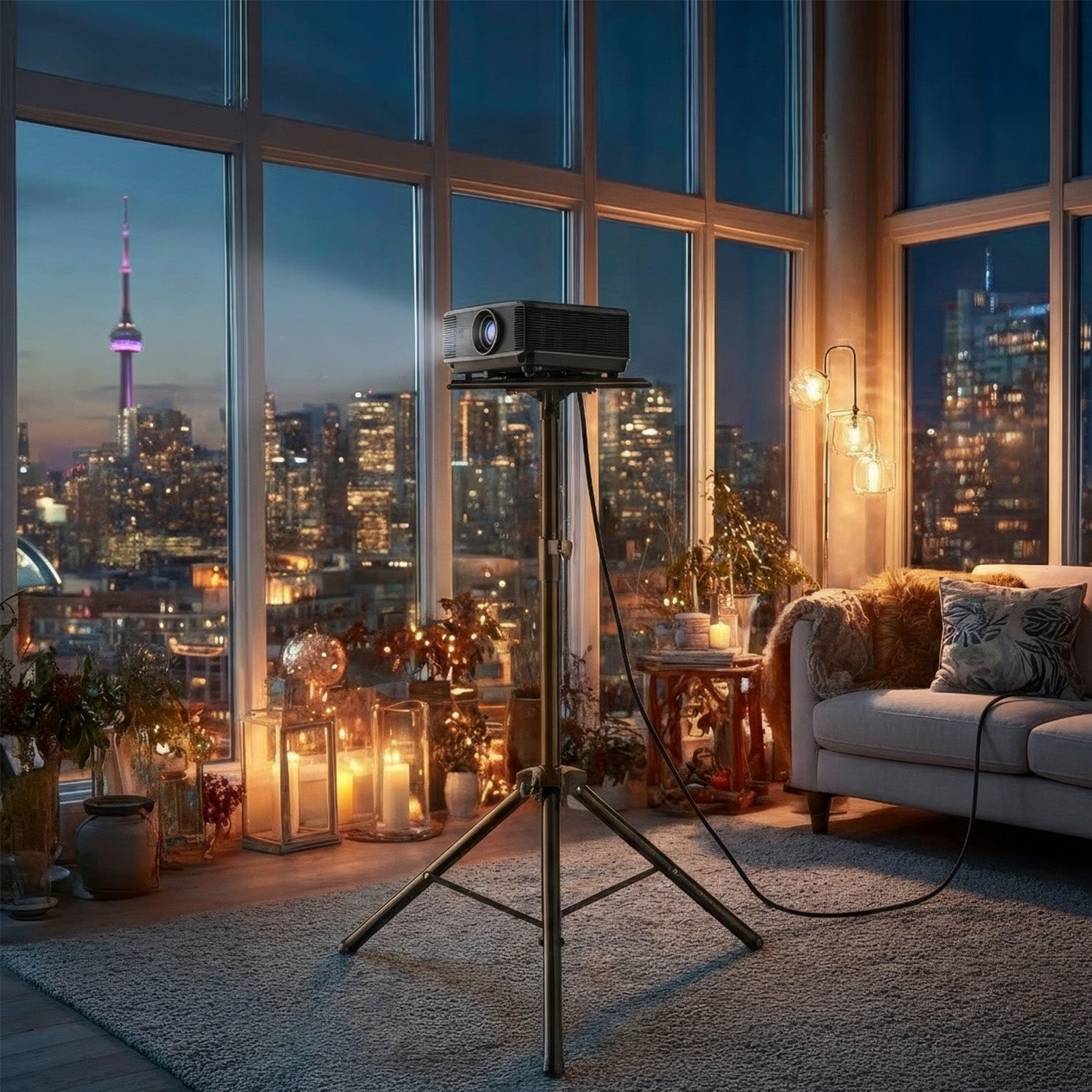 Het oppervlak van 36,5 x 26,6 cm biedt plaats aan de meeste projectoren of zelfs laptops op de markt. Bovendien kan de plank traploos worden versteld tot een maximale hoogte van 185 cm om de projectiehoogte optimaal aan te passen aan de positie van uw scherm.