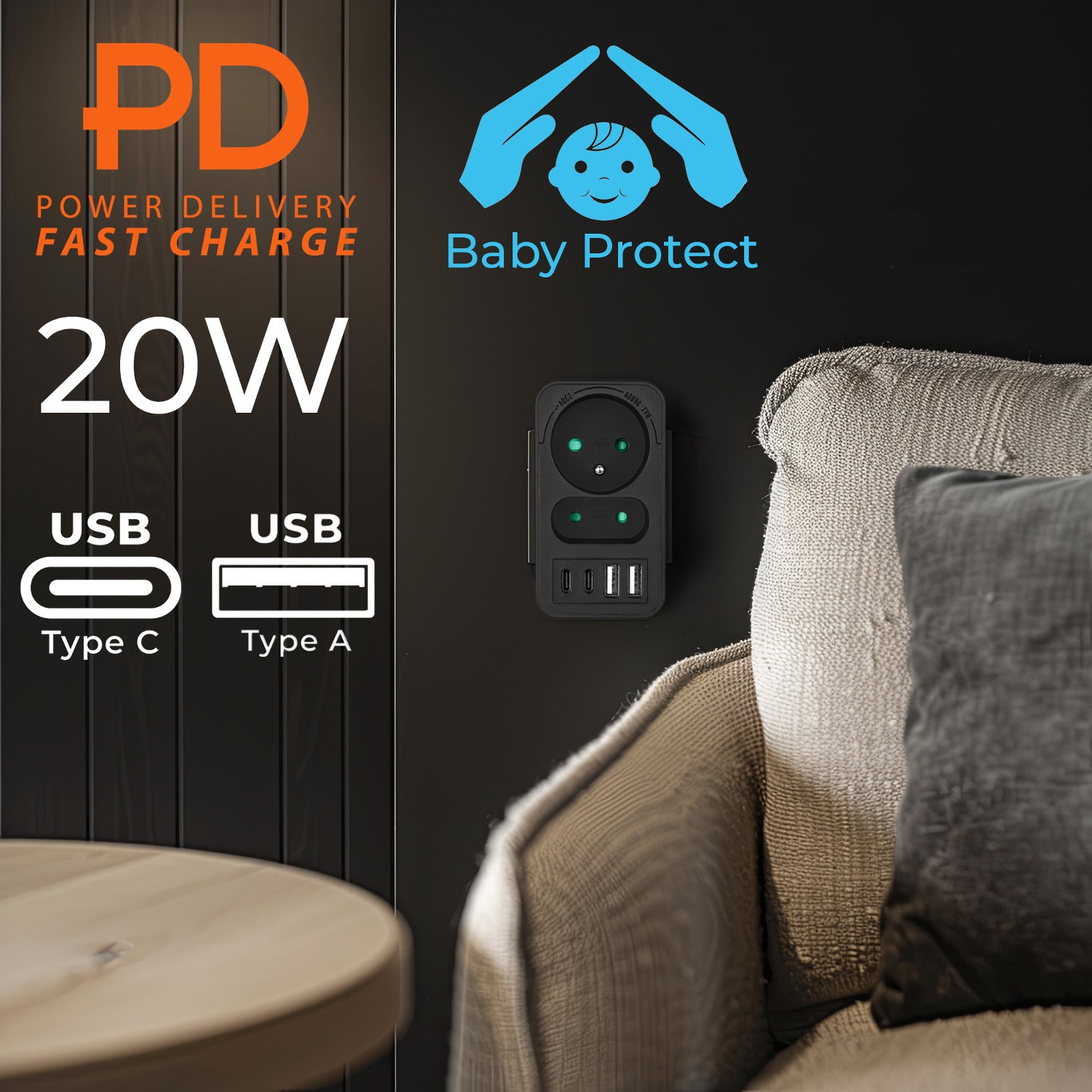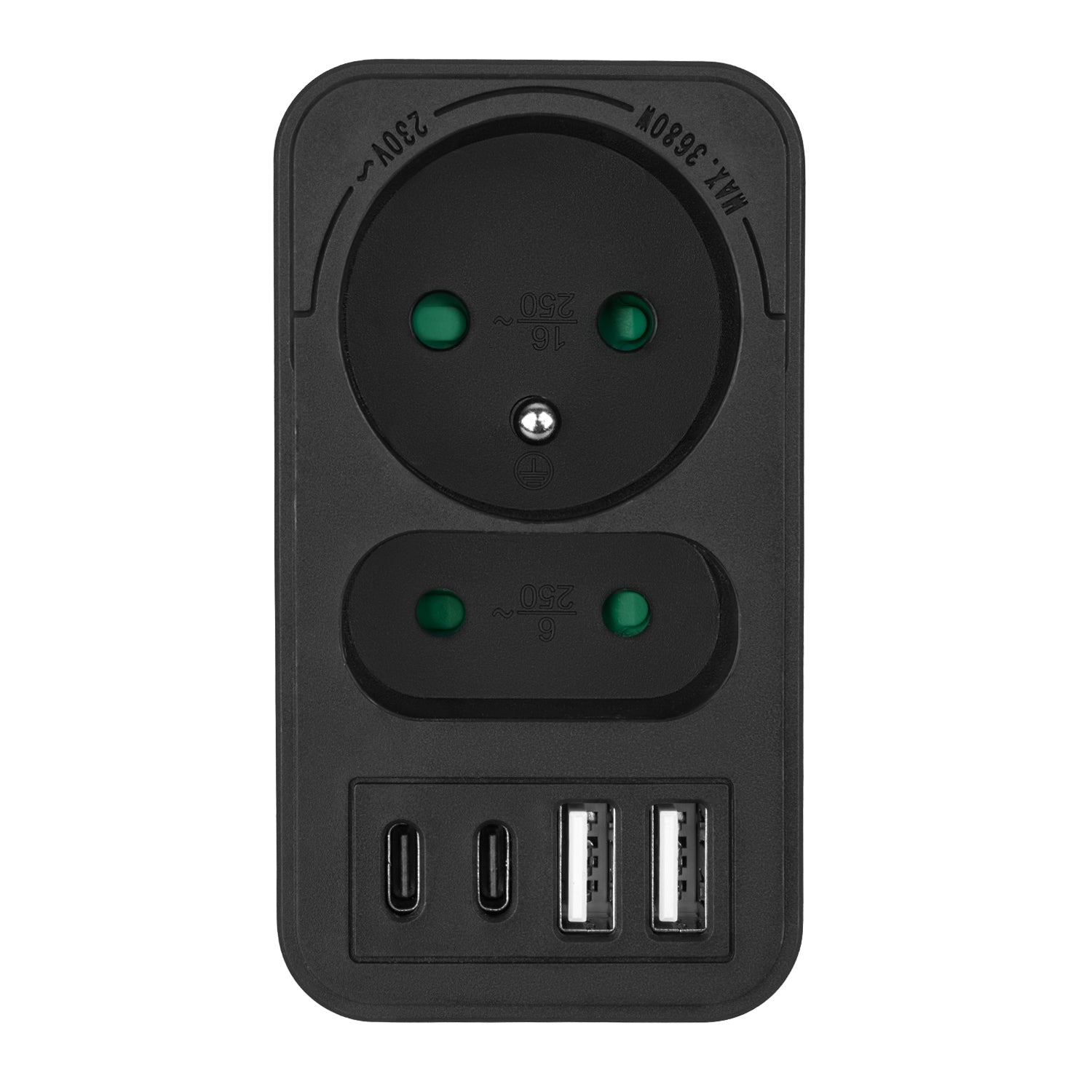 De geïntegreerde twee USB Type A-poorten met maximaal 3A (max. 18 W) zijn perfect voor het opladen van accessoires zoals draadloze hoofdtelefoons, powerbanks, Bluetooth speakers of sportarmbanden. En de twee USB Type C poorten met Power Delivery technologie (max. 20W) zorgen voor snel en stabiel opladen van moderne apparaten - smartphones, tablets, handheld consoles en andere apparaten die de Power Delivery standaard ondersteunen. Met deze combinatie kunnen meerdere apparaten met verschillende stroomvereisten tegelijkertijd van stroom worden voorzien, zonder dat er extra laders nodig zijn.