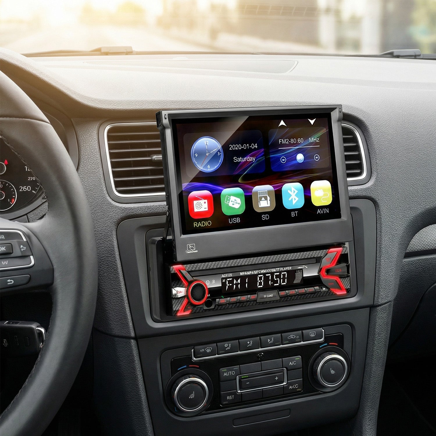 De Audiocore AC9100 autoradio is een moderne 4x50W multimediaspeler die uitstekend entertainment biedt voor zowel bestuurder als passagiers. Het apparaat heeft een intrekbaar 7-inch 1920 x 1080P elektrisch touchscreen, waarop u eenvoudig AVI-filmbestanden of bijvoorbeeld afbeeldingen in jpg-, png-formaat kunt afspelen.