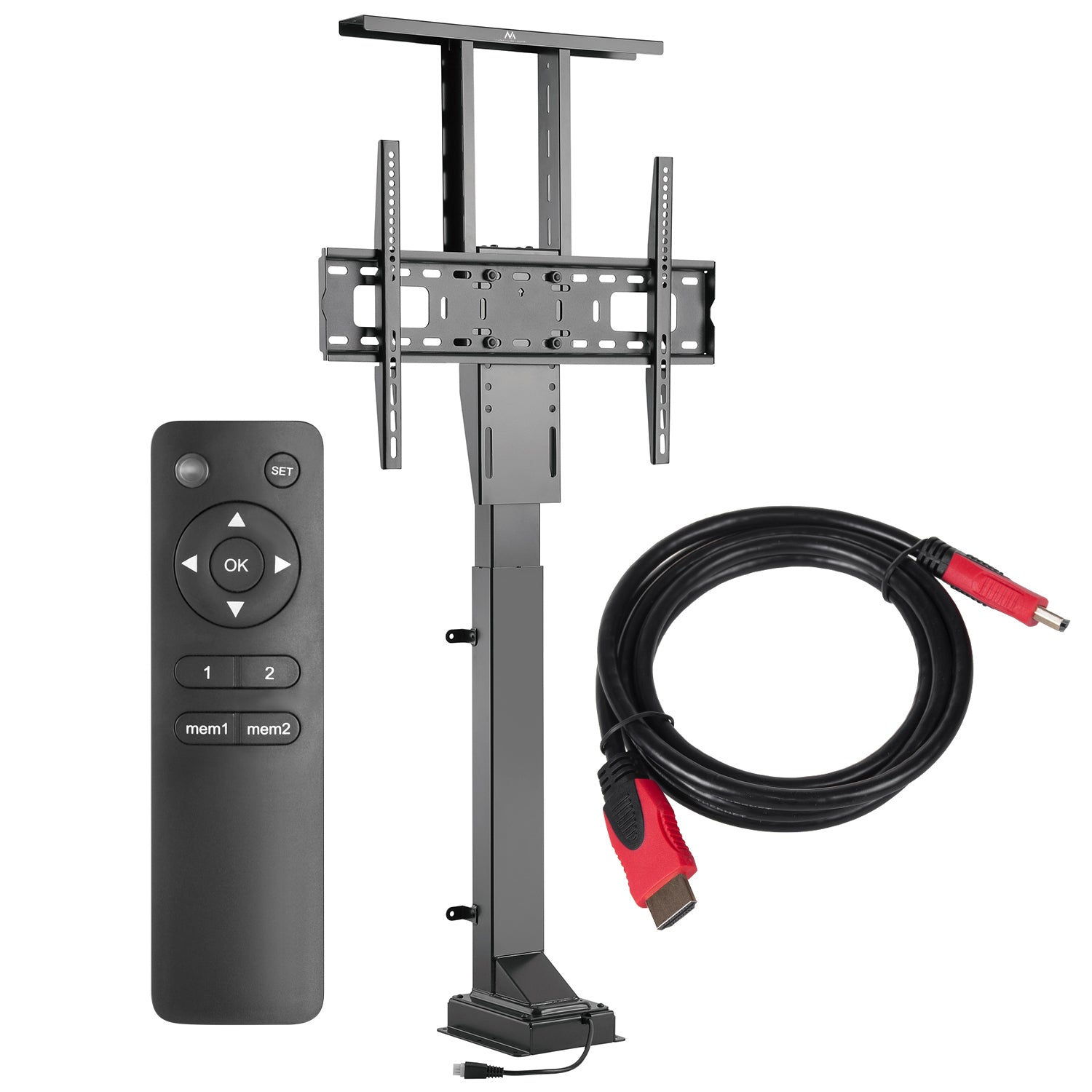 Met de meegeleverde afstandsbediening kan de hoogte traploos worden ingesteld van 68 - 158 cm. Daarnaast bevat de set een HDMI 2.0-kabel van 1,8 m, een set schroeven en montageaccessoires en gedetailleerde installatie-instructies.