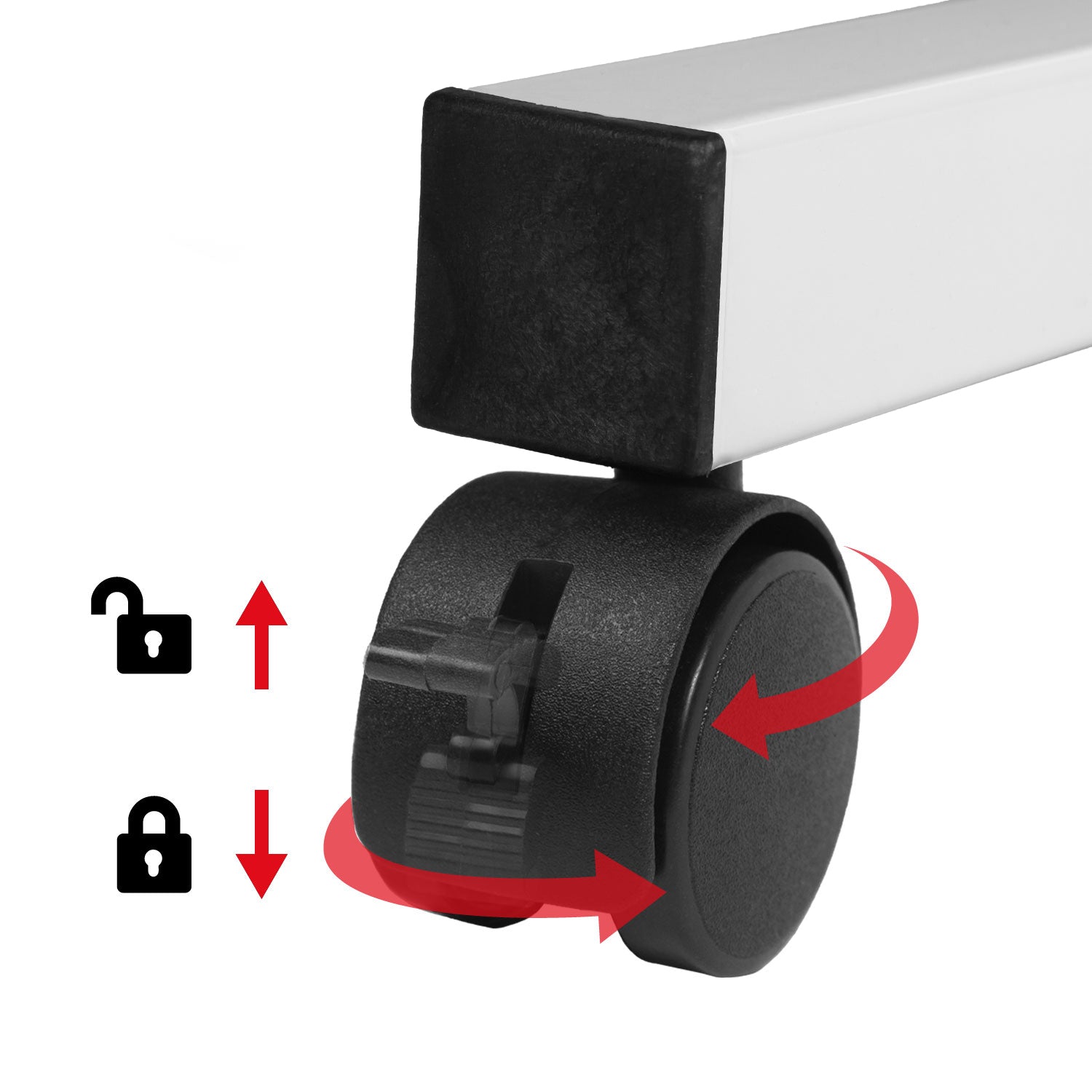 Mobiliteit van het bureau wordt gegarandeerd door 6 vergrendelbare wielen, zodat het gemakkelijk kan worden verplaatst en vervolgens vastgezet op de gewenste locatie. Het is een veelzijdige, functionele en moderne oplossing die het zowel thuis als op kantoor of in de studio goed doet.
