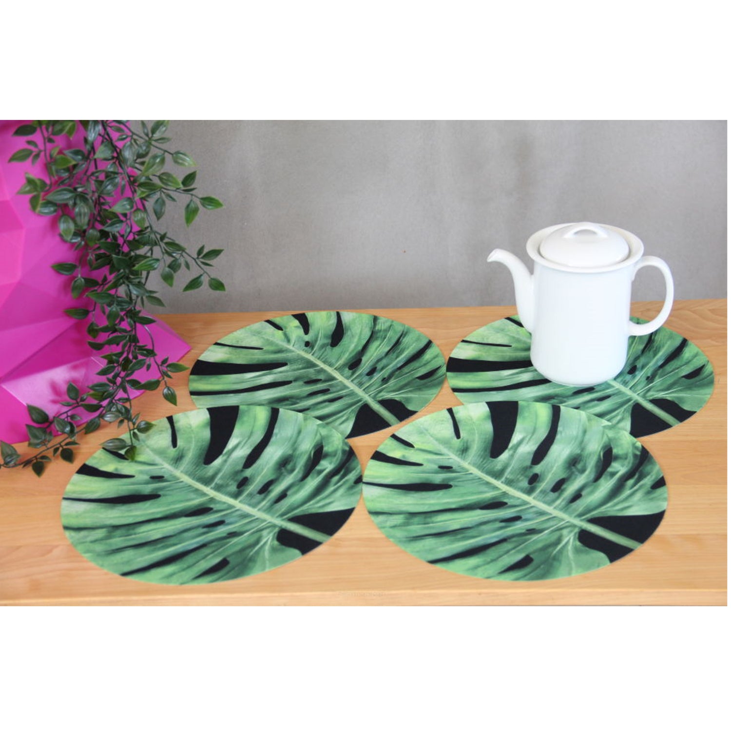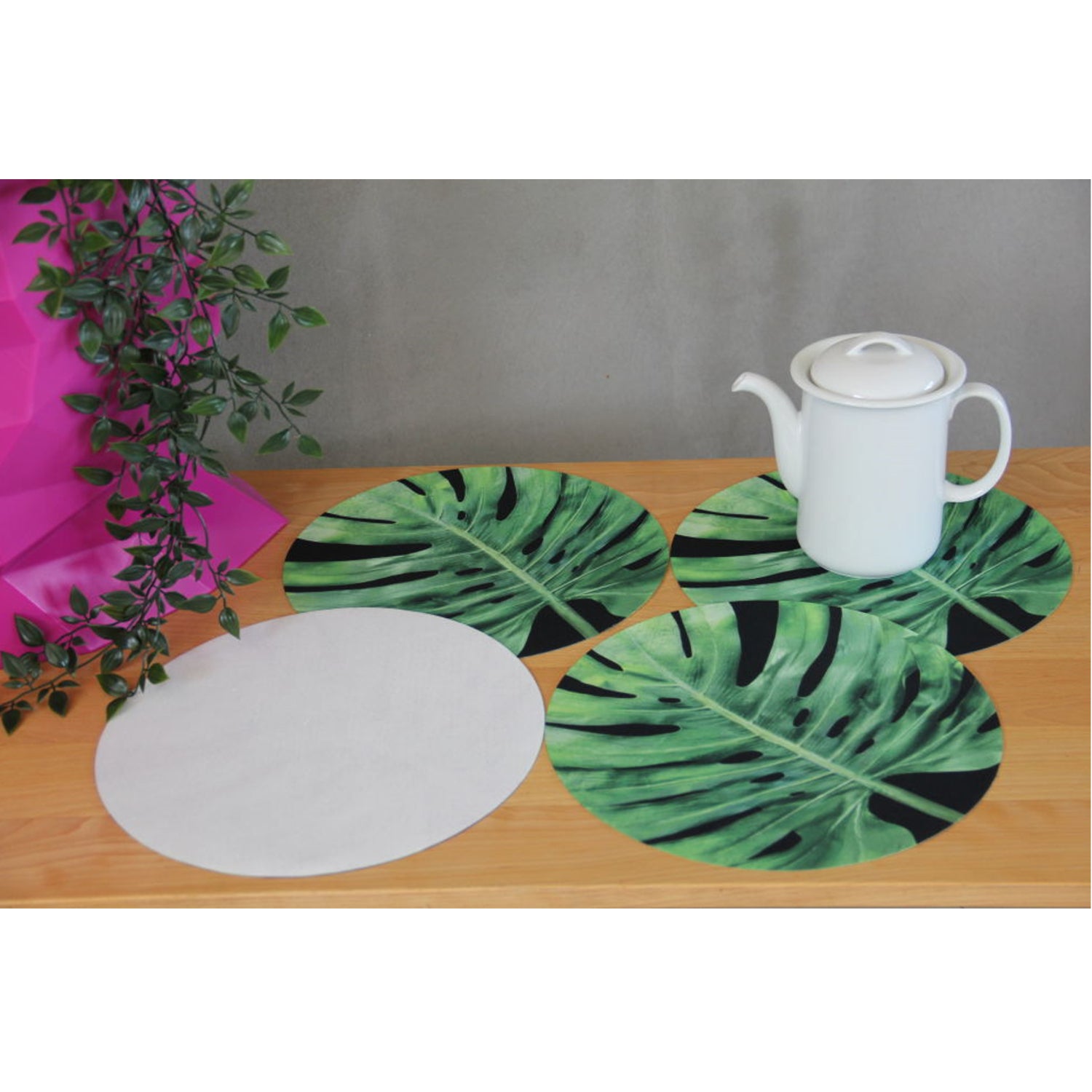 De placemats zijn rond, wat bijdraagt aan hun universele karakter, passend bij de meeste decoratieve stijlen. Ze zijn gemaakt van dun geperst polyestervilt.