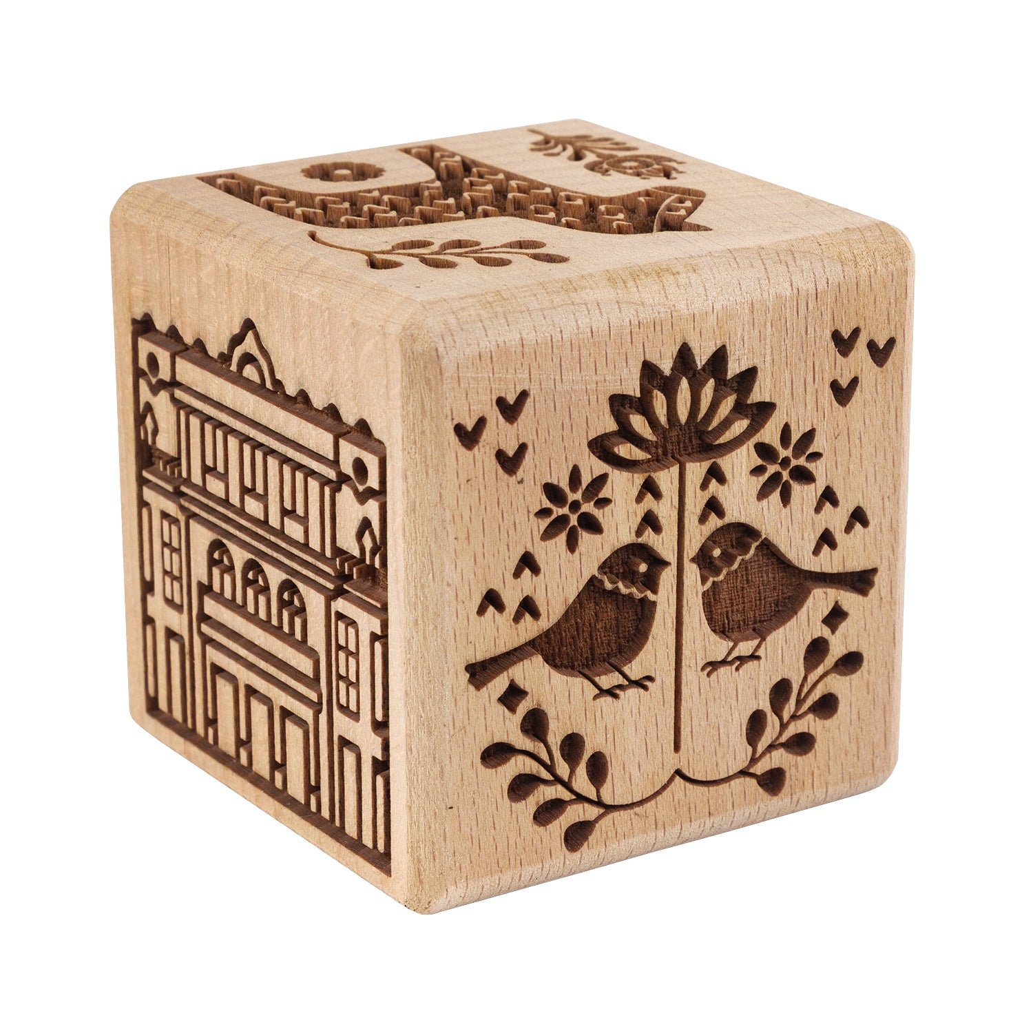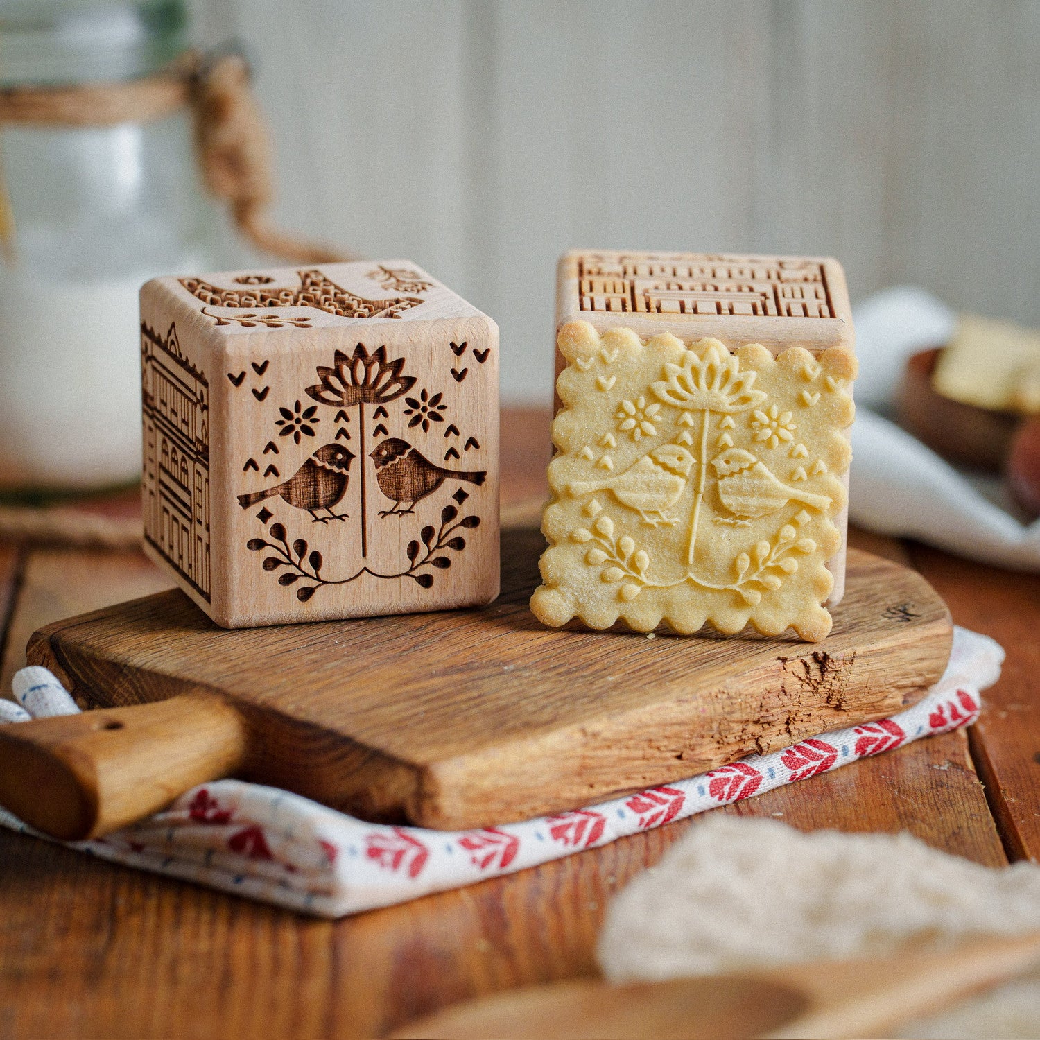 De gegraveerde beukenhouten kubus is het ideale gereedschap om ontwerpen op deeg te drukken. De kubus wordt geleverd met 6 unieke ontwerpen en de diepe gravure zorgt voor precieze details voor het maken van unieke koekjes.
