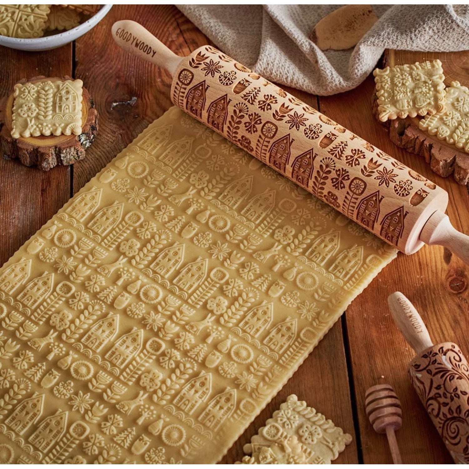Goody Woody gegraveerde taartroller, 46 cm, beukenhout, Scandinavische stijl