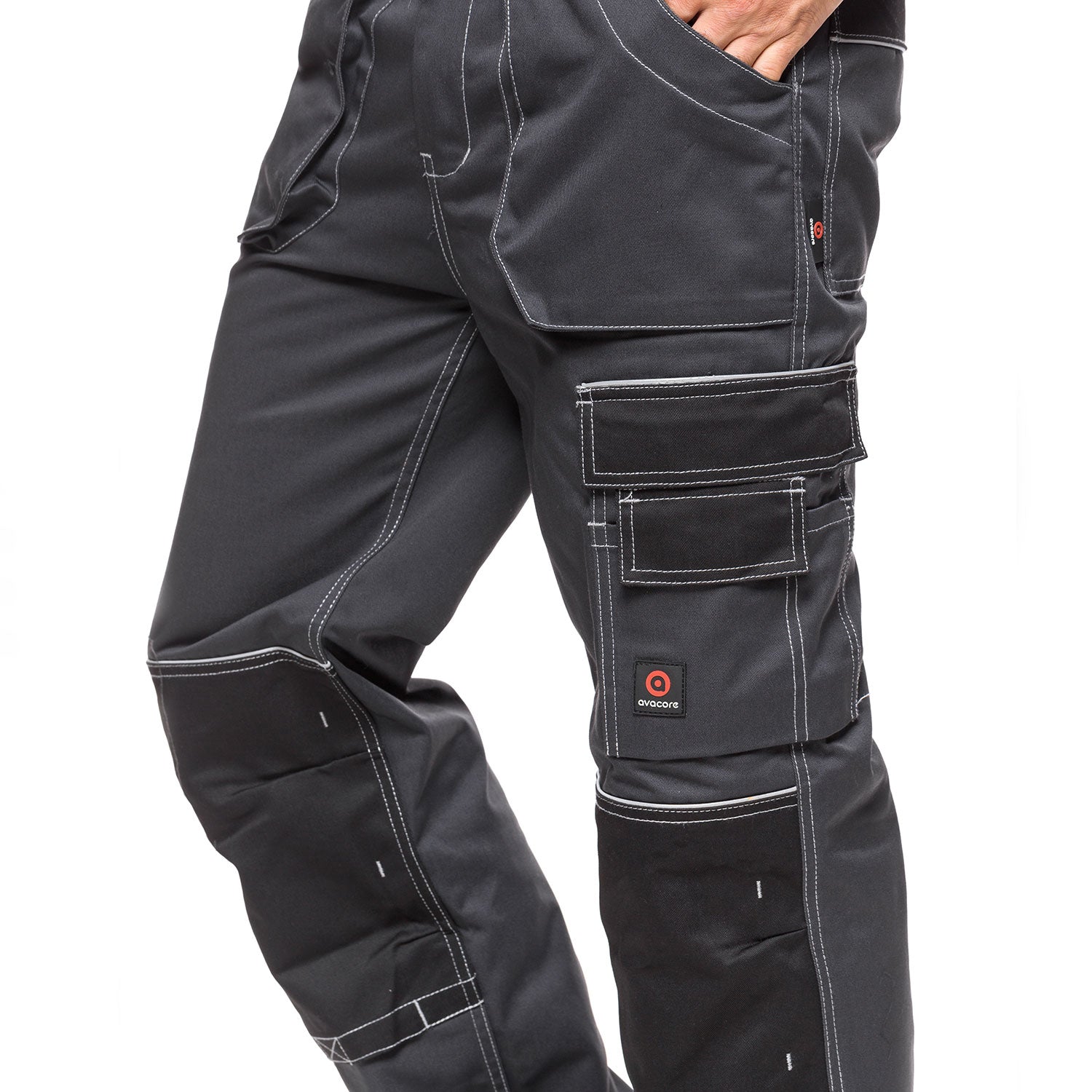 Grijs-zwarte Helios werkbroek gemaakt van duurzame stof met dubbele stiksels. Ruime, multifunctionele zakken, waaronder een zak voor een mobiele telefoon, en versterkte knieën zorgen voor extra comfort tijdens het werk.