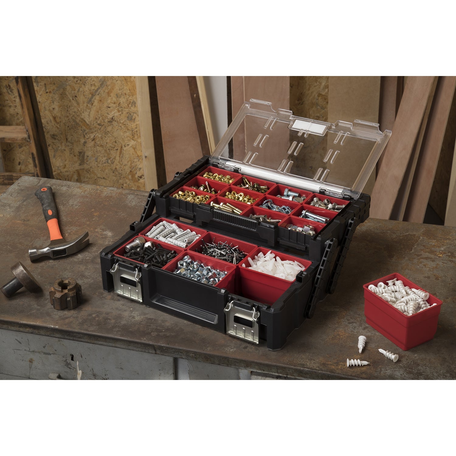 Met zijn compacte ontwerp en vele functies is de Cantilever 18 geschikt voor zowel professionals als hobbyisten. Het is een ideale oplossing voor het opbergen en organiseren van kleine onderdelen en middelgrote accessoires. De 18 uitneembare vakken houden de inhoud veilig en gescheiden, zelfs terwijl je deze lichtgewicht organizer rondtrekt. De duurzame structuur en het deksel van polycarbonaat, dat niet kan breken, zorgen er ook voor dat de organizer jarenlang meegaat.