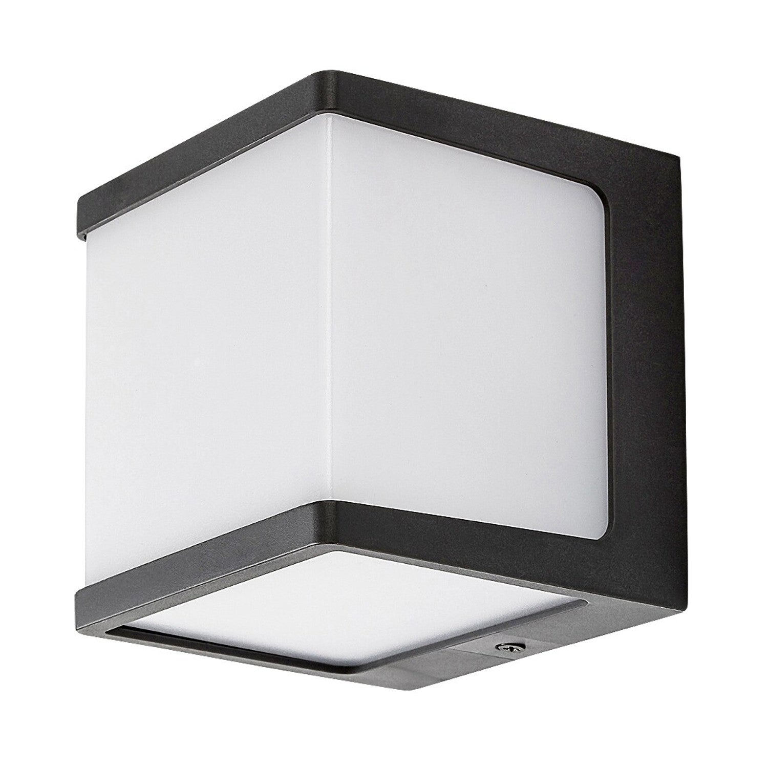 De antracietkleurige armatuur die volledig van kunststof is gemaakt, wordt gekenmerkt door zijn geometrische vorm en wordt gecompleteerd door een witte kubusvormige diffuser.