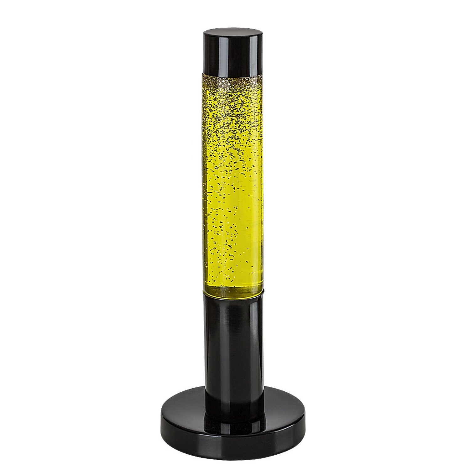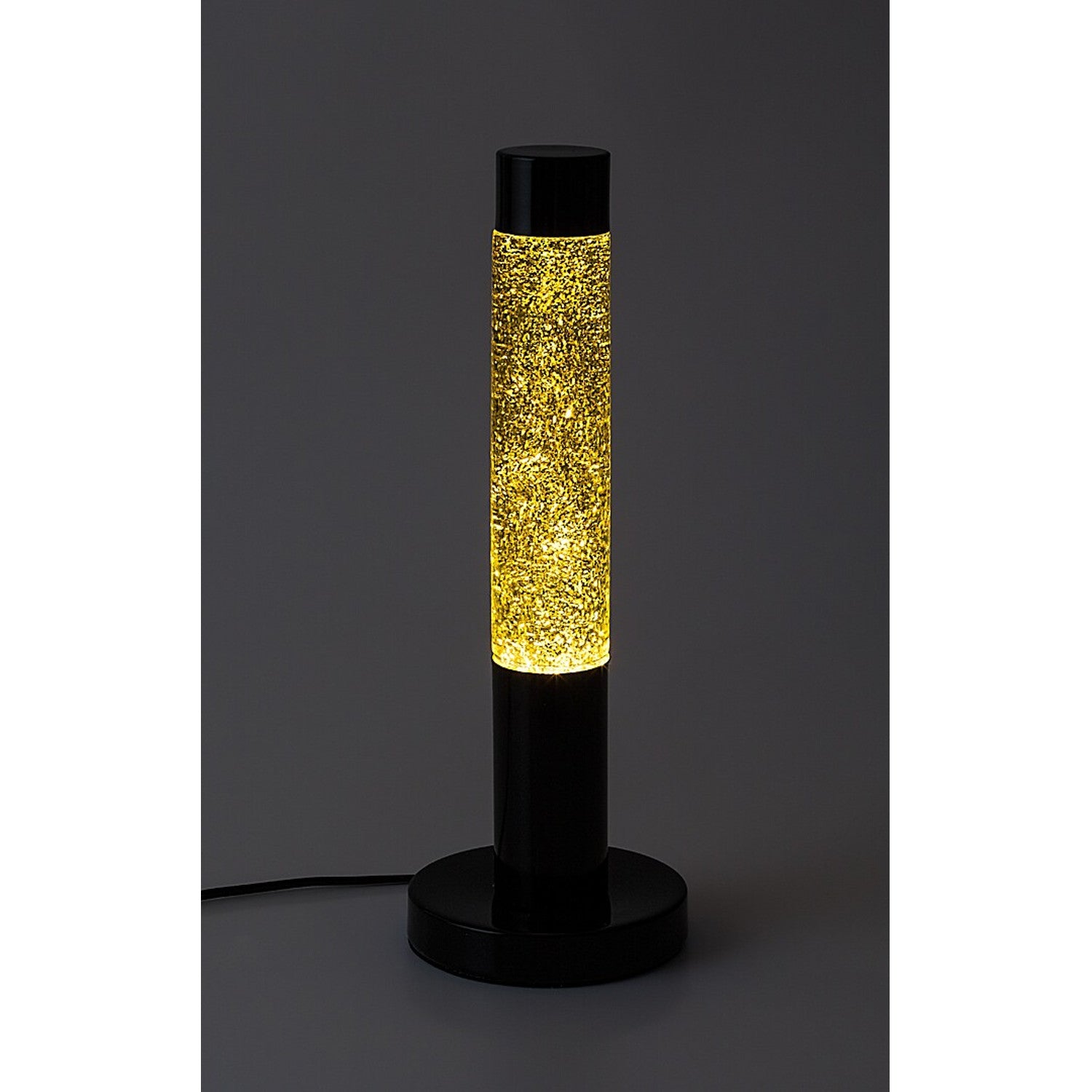 De Rabalux Lavastic decoratieve lamp is de perfecte keuze voor wie op zoek is naar spectaculaire en elegante sfeerverlichting. De binnenkant van de lamp is gevuld met een vergulde, afbladderende vloeistof, wat dit model een heldere, feestelijke uitstraling geeft. De cilindrische behuizing en de decoratieve schijfvormige voet zijn gemaakt van zwart metaal, terwijl de lampenkap van helder glas is.