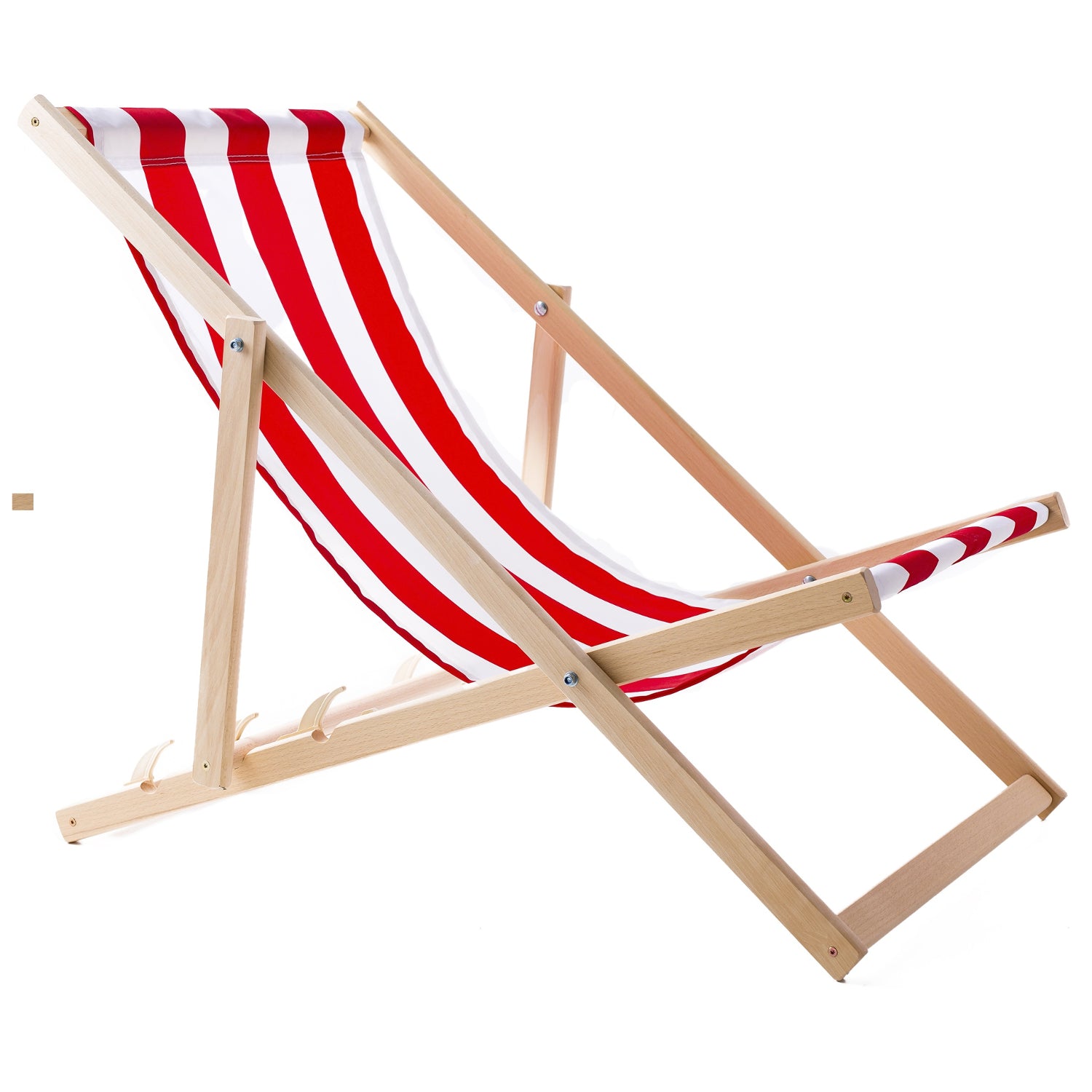 De ligstoelen hebben een stevig beukenhouten maar lichtgewicht frame. Dit maakt het gemakkelijk om ze mee naar buiten te nemen, naar het strand of in de tuin. De zitting is gemaakt van hoogwaardige stof en biedt comfort en gemak, en met de stapsgewijze verstelling kunt u de ligpositie aanpassen aan uw individuele voorkeuren.
