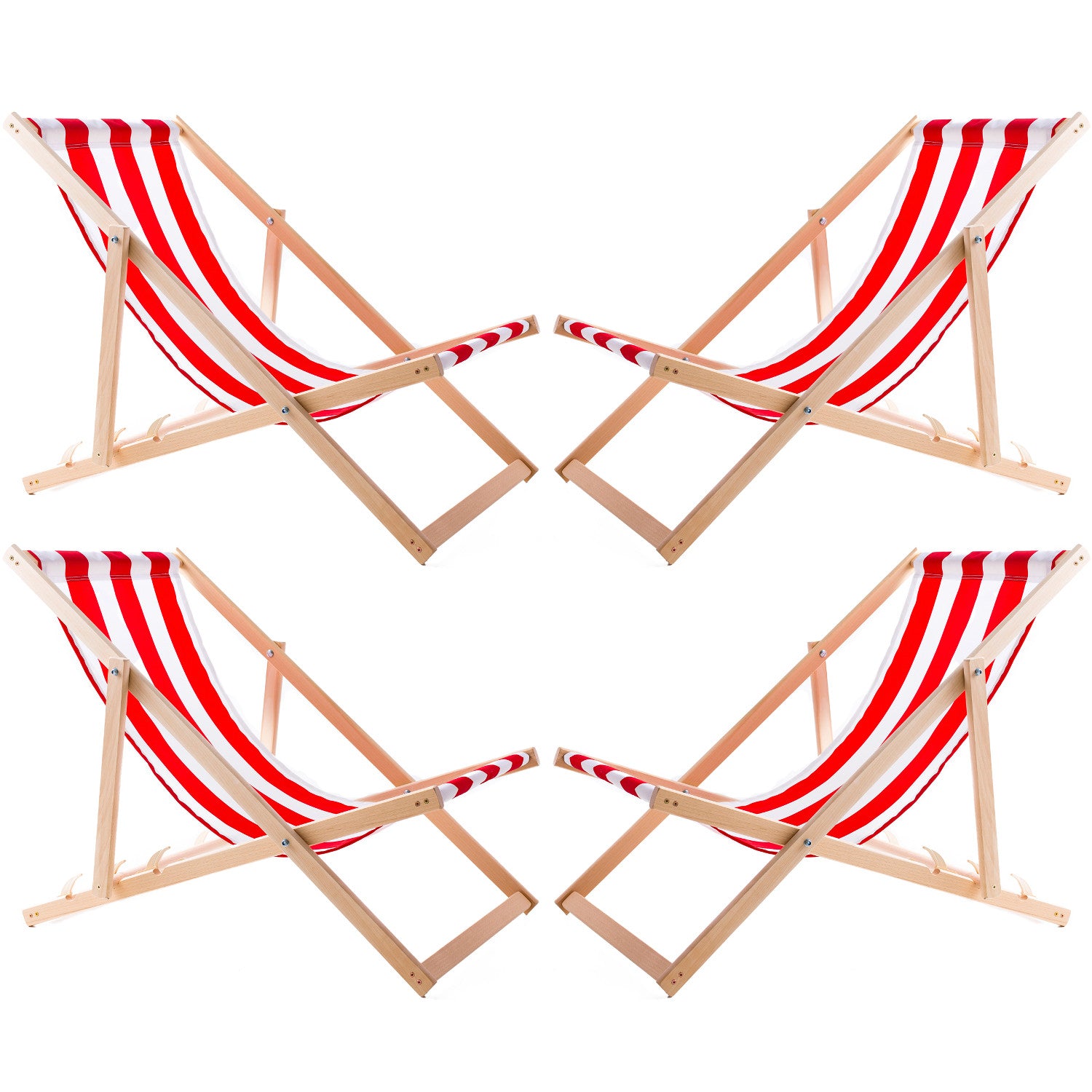 Set van 4 stuks - Strandstoel - ligstoelen - Verstelbaar - Inklapbaar - beukenhout - Wit met rode strepen
