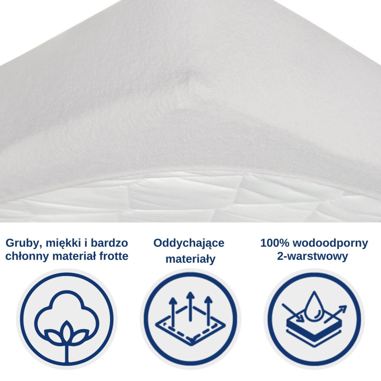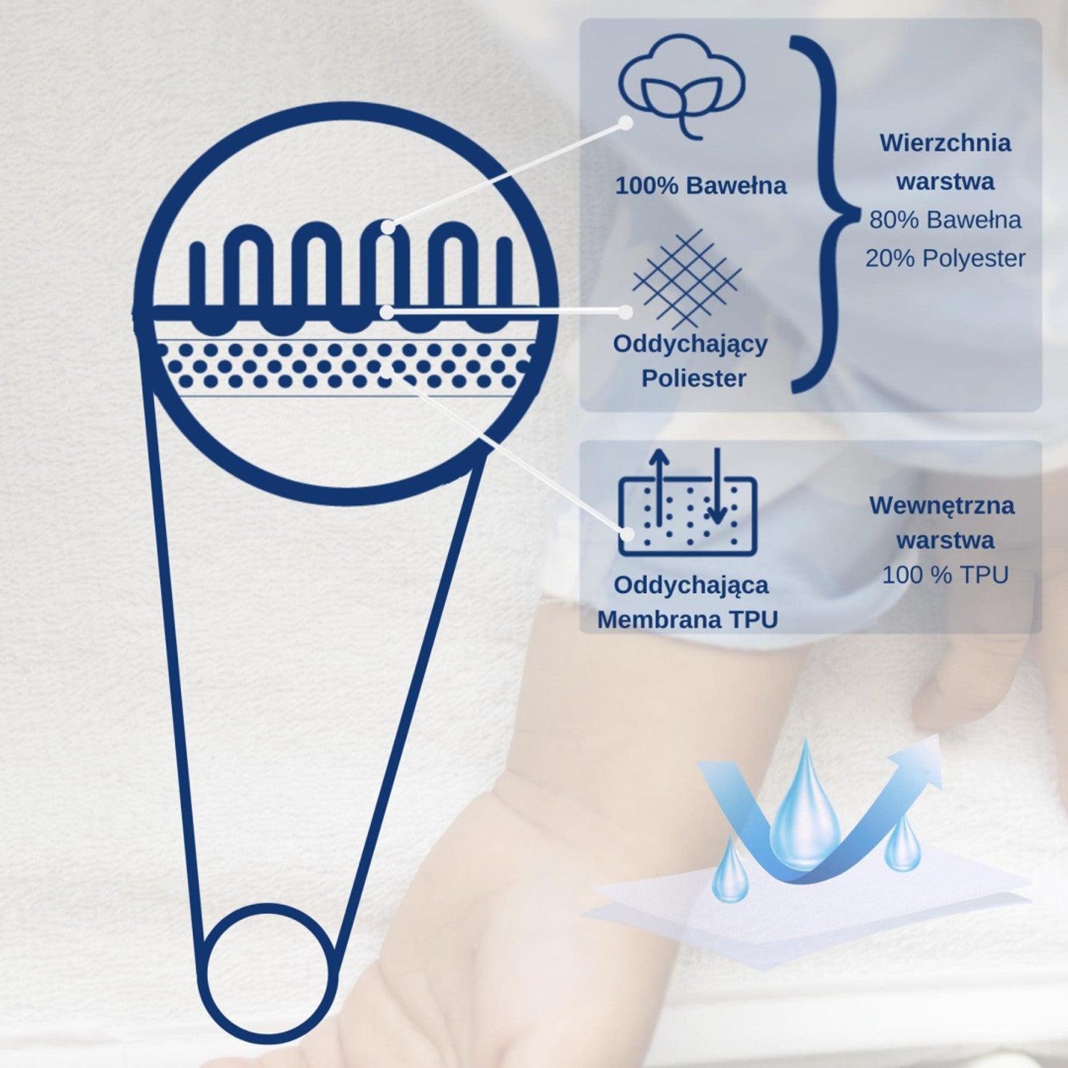 De bovenste laag van het laken is gemaakt van een dikke, zachte en zeer katoenachtige stof, terwijl de binnenste laag, die de bovenkant van het matras beschermt, gemaakt is van een ademend en waterdicht TPU-membraan.